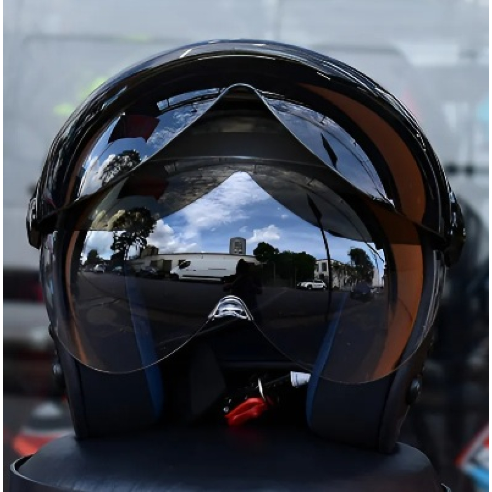 Viseiras: Dupla - cristal e fumê, ambas em policarbonato de 2 mm com tratamento antirrisco e sistema de troca rápida